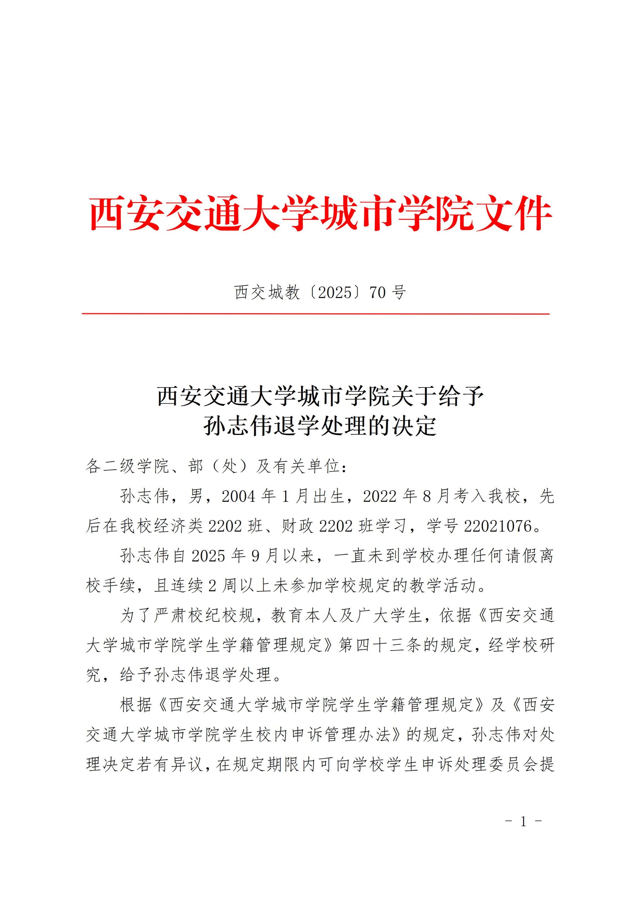 西安交通大学城市学院关于给予孙志伟退学处理的决定