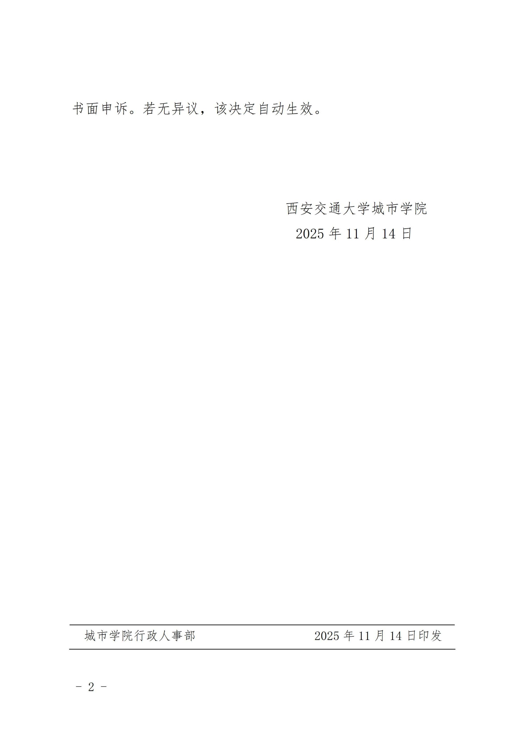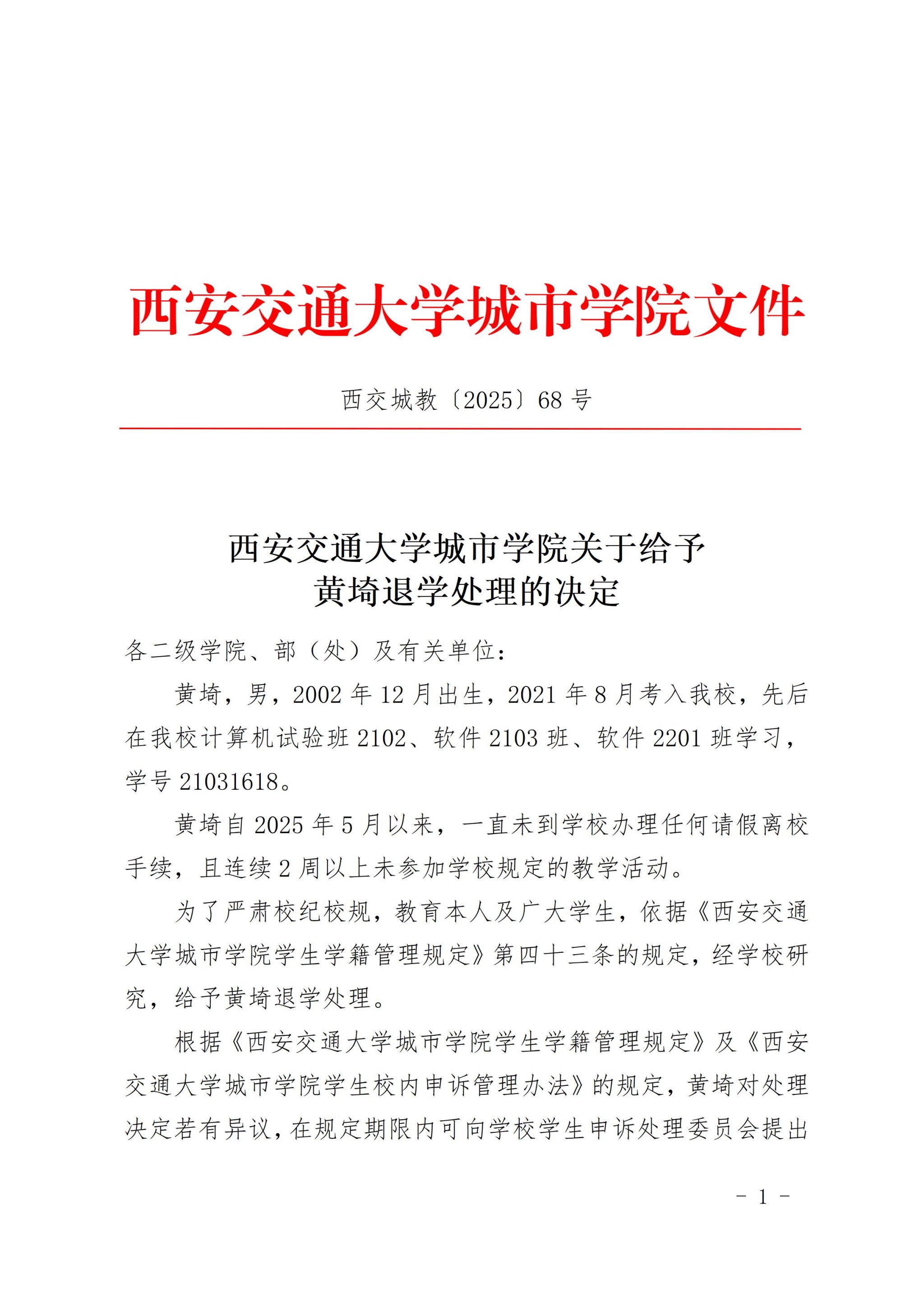 西安交通大学城市学院关于给予黄埼退学处理的决定