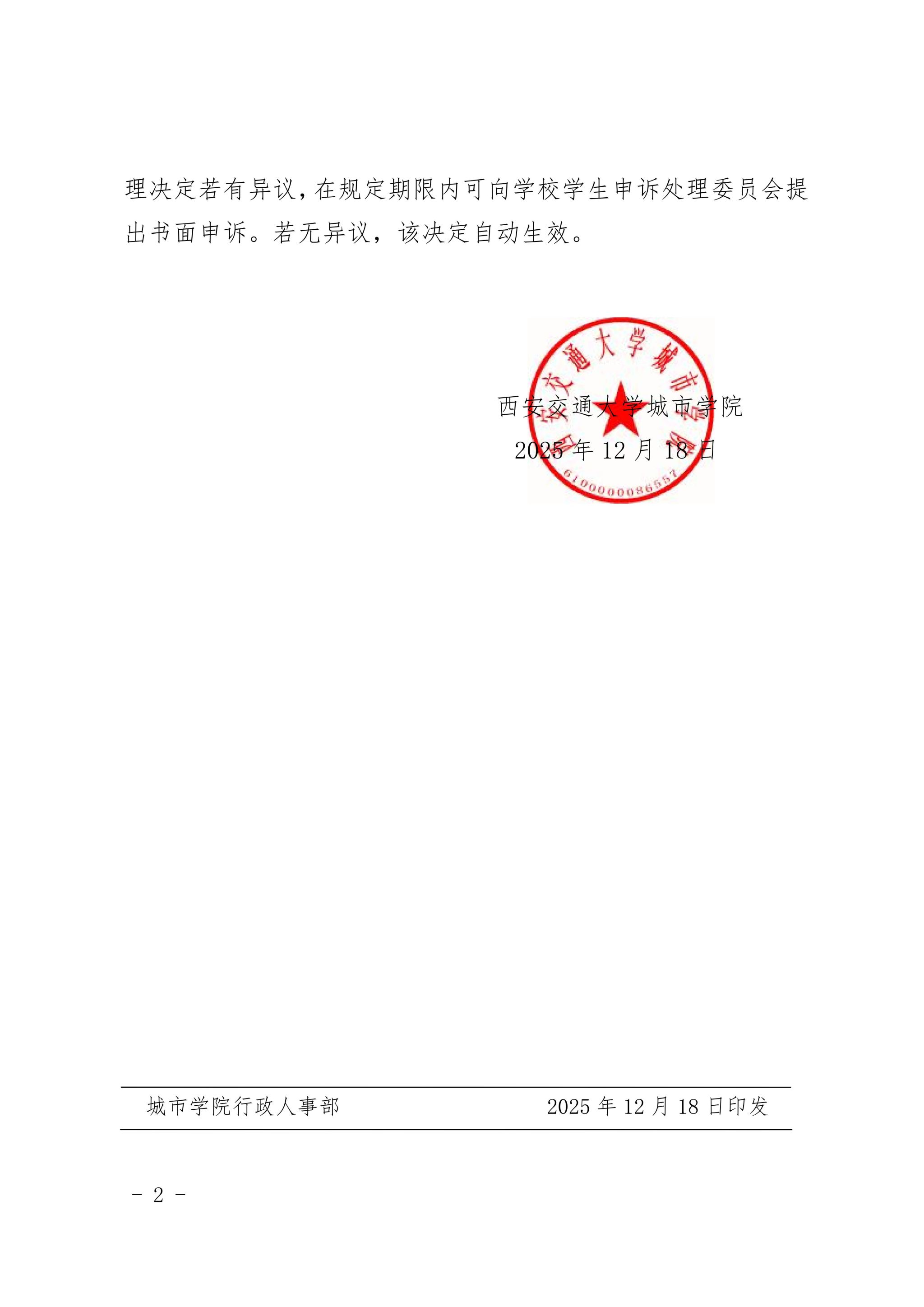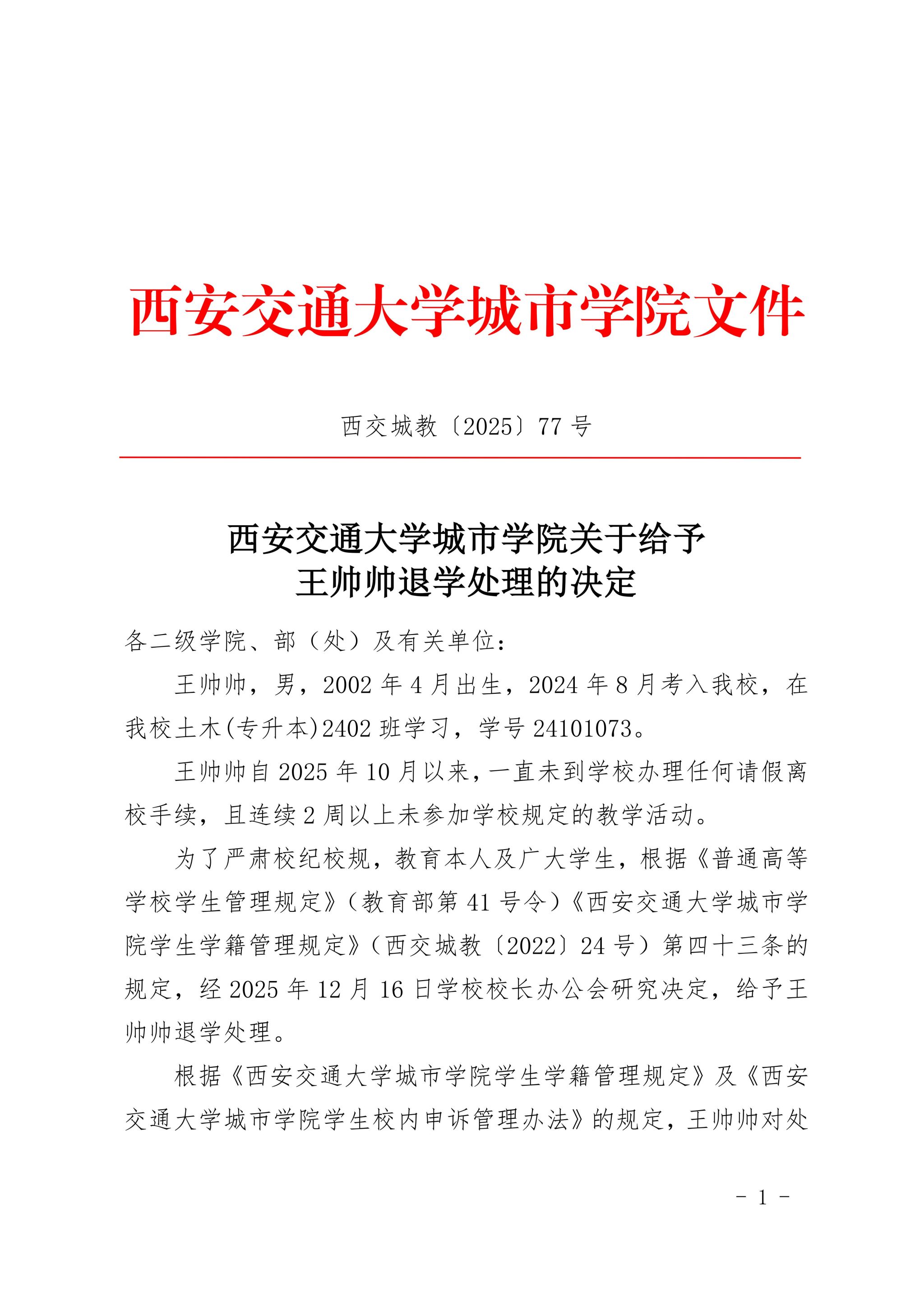 西安交通大学城市学院关于给予王帅帅退学处理的决定
