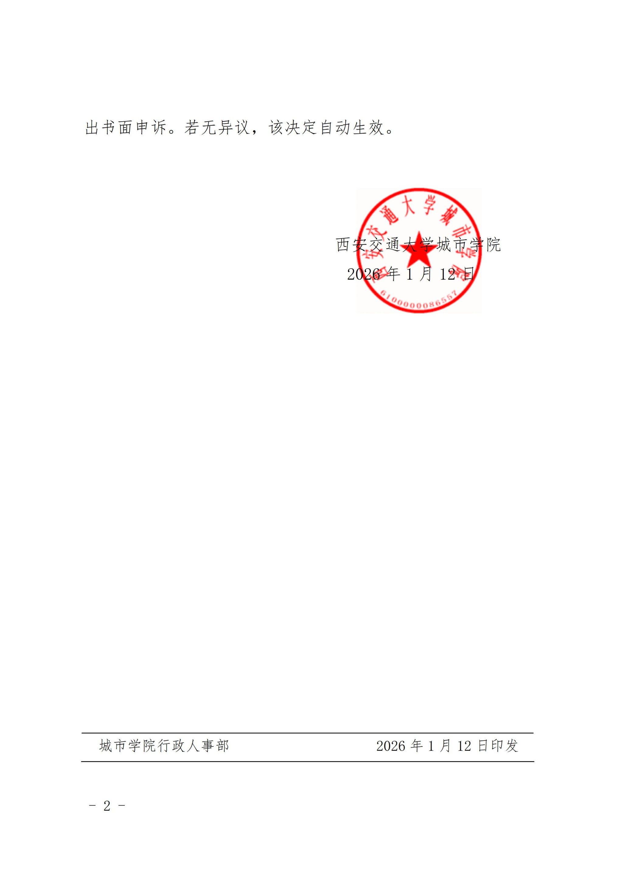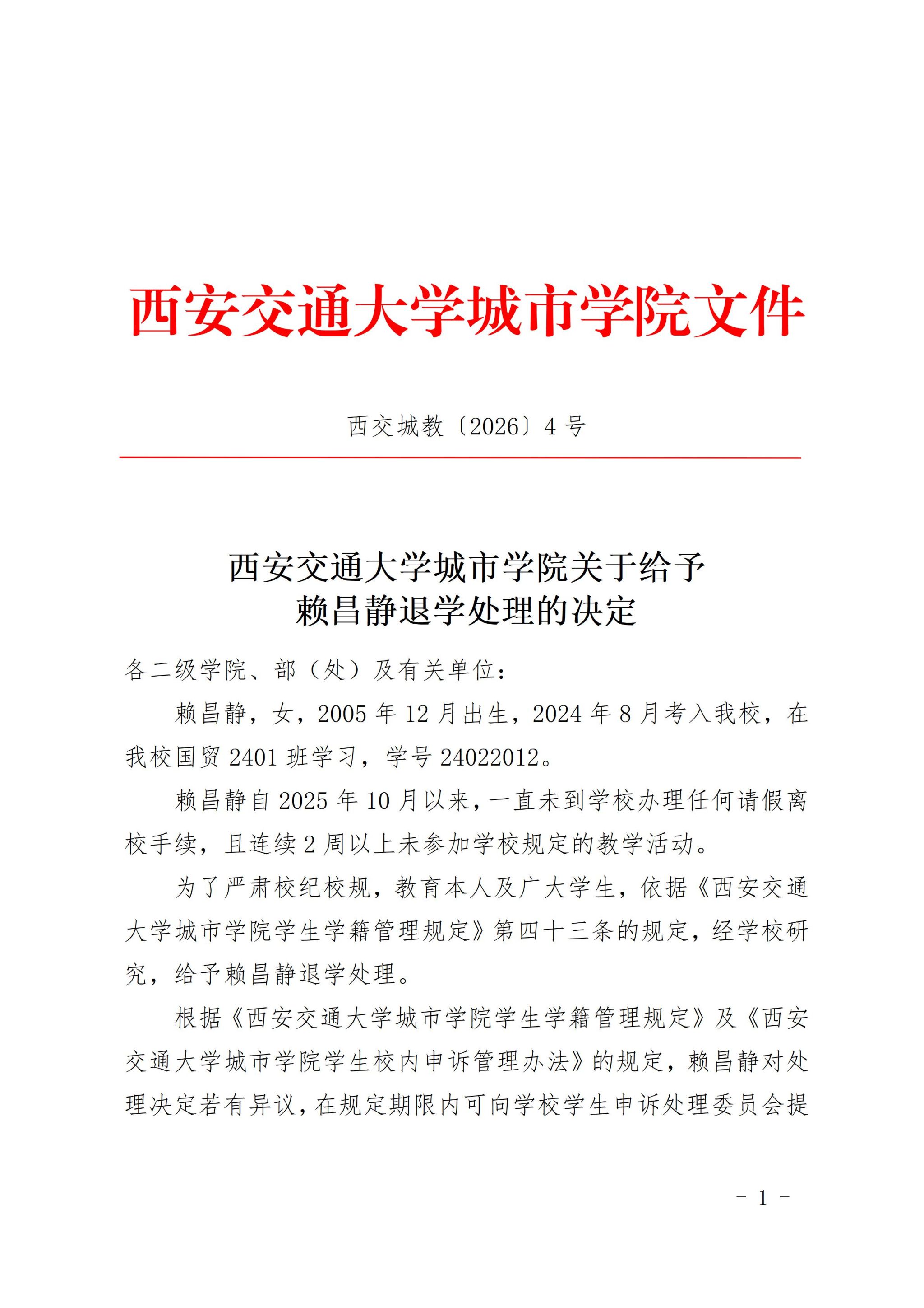 西安交通大学城市学院关于给予赖昌静退学处理的决定