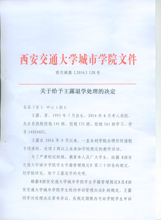 王露,男,西安交通大学城市学院经济系经统161班学生,学号:14024021,2016年9月开学至今未返校报到,依据《西安交通大学城市学院学生学籍管理规定》第三十四条,给予该同学自动退学的处理。